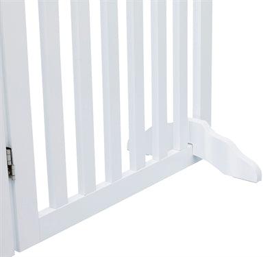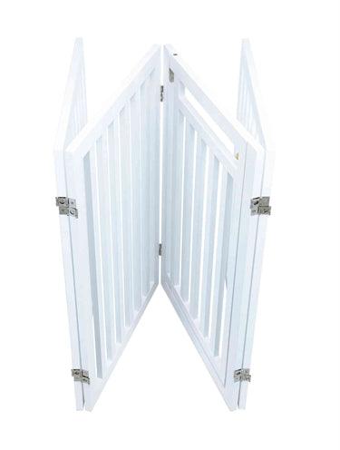 Das Trixie Hundegitter mit Tür Weiß 60-160 x 81 cm ist ein vierteiliges Gitter aus lackiertem MDF, das vielfältig aufgestellt werden kann und über Standfüße verfügt.