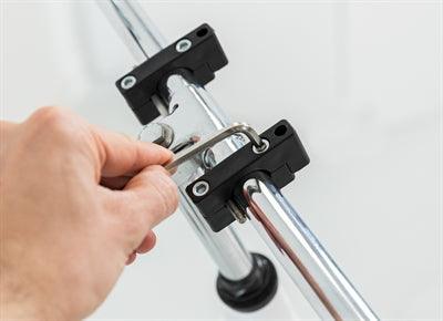 Der Halter lässt sich sicher am Lenker Ihres Fahrrads befestigen. Dank seines cleveren Designs sitzt der Halter fest am Lenker, ohne ihn zu beschädigen. Die Befestigungshaken des Korbs gleiten dann in die dafür vorgesehenen Öffnungen. So rastet der Korb sicher ein und kann während der Fahrt nicht wackeln oder sich lösen.